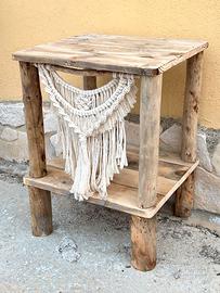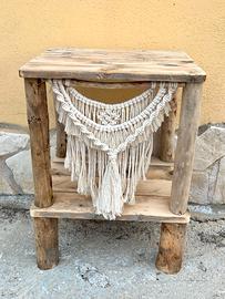 Comodino in Legno naturale Stilo Rustico 2 Ripiani. Altezza 52,2 cm, larghezza 39 cm, lunghezza 34 cm. Con elementi macramè. Fatto a mano. Comodino aggiungerà un tocco di unicità al tuo arredamento.