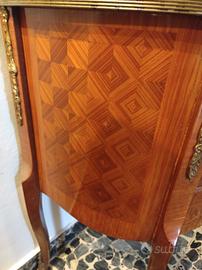 comodino in radica di noce con tre cassetti e decoro molto bello 70 di altezza 60 di larghezza e 38 di profondità