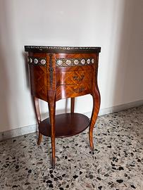 tavolino rotondo riproduzione in stile barocco con intarsi e piccoli fregi bronzo e maiolica