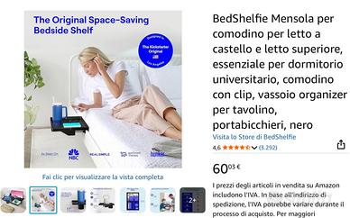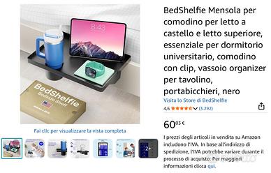 Vendo il praticissimo BedShelfie – Mensola/Comodino con clip per letto a castello o letto superiore (bianco, 32,4P x 24,1L x 7,6H cm) in condizioni eccellenti, praticamente come nuovo. Usato pochissimo, nessun graffio, nessun difetto, nessun segno di usura.
