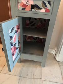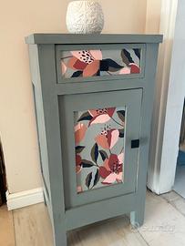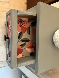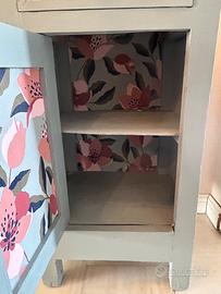 Bellissimo comodino vintage recuperato in stile eclettico botanico. In colore light petrol, pomelli neri, carta da parati botanica. Nel cassetto e’ stata recuperata una vecchia scritta risalente a inizio secoli. Dimensioni 41x33x80. Vendo 65 euro. Solo consegna a mano no spedizione