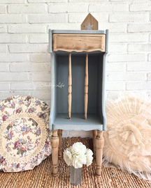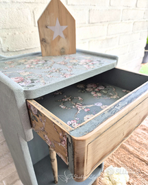 Originalissimo comodino/mobiletto con cassetto, colore grigio azzurro in due tonalità e legno grezzo protetto con cera naturale.