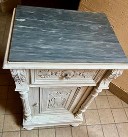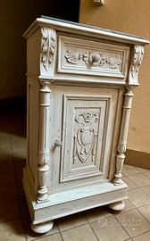 Comodino/ Mobile Mettitutto Barocco anni 40, in resistente legno massello. Splendidi intagli nella parte frontale, piedini a cipolla.