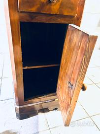 • Materiali e Finitura: Il mobile presenta una bellissima impiallacciatura in piuma di noce (o radica di noce) sul frontale del cassetto e dell'anta. Questa tecnica utilizza la parte dell'albero dove i rami si biforcano per creare quel disegno specchiato e "fiammato" molto decorativo.