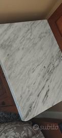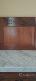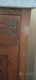 Comodino o mobiletto da camera stile Liberty (Art Nouveau) italiano "geometrico-fiorito" - sulla base delle informazioni tramandate in famiglia - databile tra il 1900 e il 1915. Presenza di incisioni sulla porta e sul cassetto: i fiori stilizzati e le linee verticali che terminano con piccoli rombi sono decorazioni tipiche dell'area italiana (influenzate dalla Secessione Viennese). Legno di noce (o ciliegio) con piano in marmo bianco. Il marmo ha la particolarità di avere l' "alzata" (la parte posteriore in legno), il che lo rende molto aggraziato. Dimensioni: larghezza 41 cm profondità 32 cm altezza 83 cm