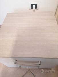 Comodino con due cassetti, colore olmo e bianco. L'angolo basso destro del secondo cassetto è lievemente scheggiato. L'interno del secondo cassetto presenta qualche piccola scheggiatura. Misure 45x45x36.