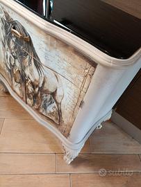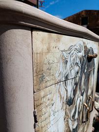 Questo mobiletto in legno massello ha ripreso vita attraverso un restyling artistico che unisce storia, forza e raffinatezza. L'immagine del cavallo, simbolo di libertà e potenza, emerge con un effetto invecchiato che racconta il tempo e la memoria. Ogni dettaglio è stato curato con passione: trattato contro i tarli, stuccato e rifinito con cera Jasmina, per protezione e durata. Il vetro nero sottile aggiunge un tocco di mistero e modernità, creando un equilibrio perfetto tra vintage e contemporaneo.