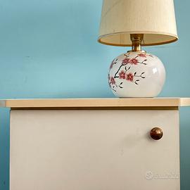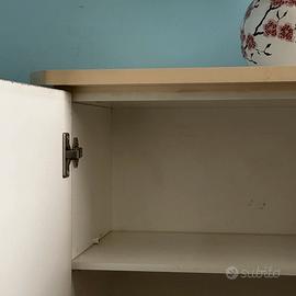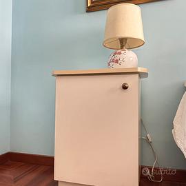 comodino, in legno laminato bianco, con anta chiusa e due ripiani interni.
