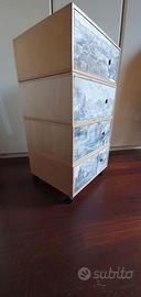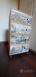 Mobiletto multiuso con 4 ruote, si può usare come scarpiera. Fatto a mano di multistrato di legno con le antine decorate in tecnica découpage.