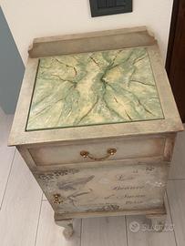 Comodino d’epoca rivisitato in stile shabby e dipinto a mano. Piano finto marmo Misure 39,5x35xH67 piu mensolina