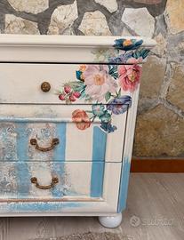 Con i suoi colori delicati, le finiture decapate e i dettagli floreali è interamente restaurato a mano