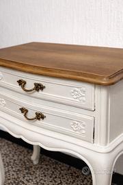 Elegante comodino stile shabby chic/provenzale, in legno laccato bianco con piano superiore effetto legno naturale. Dotato di 2 cassetti con maniglie decorative e dettagli intagliati, gambe sagomate che lo rendono raffinato e adatto a qualsiasi ambiente. Ideale per camera da letto, casa elegante, B&B o arredamento classico/moderno. Condizioni: ottime, ben tenuto. Se interessati posso fornire misure.