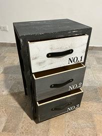 Comodino vintage ideale per soggiorno e camere. Stile vintage con 3 cassetti decorativi numerati a tema industry. -Caratteristiche: Struttura in legno decorato scuro con interni dei cassetti in rovere. Cassetti profondi per mettere qualsiasi cosa che faccia al caso vostro. -Condizioni: in perfetto stato Vendo per cambio d’arredamento -Dimensioni: Larghezza 36 Profondità 26 Altezza 58 - Disponibile solo ritiro a mano in zona Ardea 00040 o Roma 00146 Per qualsiasi info non esitate a contattarmi