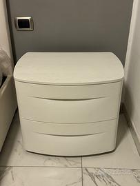 Comodino Tomasella modello Bogart in vero legno con 2 cassetti a chiusura rallentata. Laccato Bianco a poro aperto con venature del legno a vista.