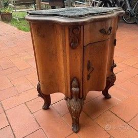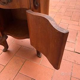 comodino primi anni '900 in noce massello in stile barocco parzialmente ristrutturato con maniglie e cerniere in ottone brunito con cassetto superiore e antina in legno pieno gambe intagliate a mano