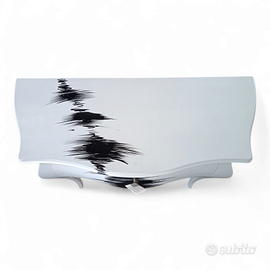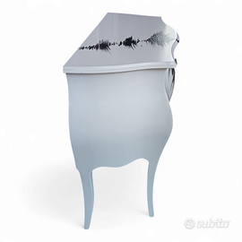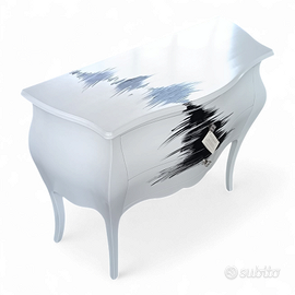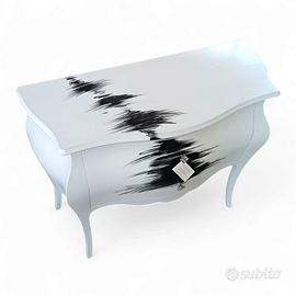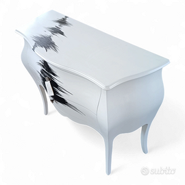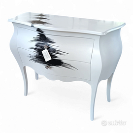 Questo elegante cassettone da ingresso bombato è un'opera d'arte artigianale. I cassetti laccati con finitura bianca moderna sono arricchiti da un disegno a macchie nero dipinto a mano creano un'atmosfera affascinante di charme rustico. I cassetti offrono uno spazio aggiuntivo per riporre oggetti preziosi. Realizzata con legno di alta qualità, questo cassettone è un pezzo da collezione che aggiungerà un tocco di raffinatezza alla tua casa. Le dimensioni sono perfette per una camera o una sala. Un acquisto che affascinerà gli amanti dell'artigianato provenzale per anni a venire.