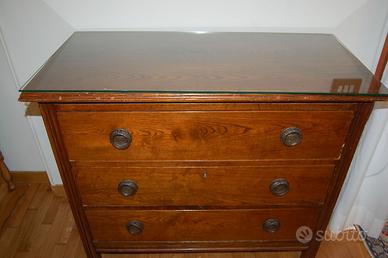 Comoncino in rovere con tre cassetti. piano in vetro a protezione. tre cassetti. misure H. cm. 81, L. cm. 90, P. cm. 45