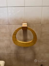 Complementi d’arredo bagno in legno di ottima qualità, in perfetto stato, come nuovi. Specchio con faretti, passamano, portasciugamani, 2 portasapone, portaspazzolini, appendino, scopino e plafoniera.