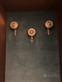 Mobile da ingresso, divisibile in due, sopra anta a specchio con dentro parete in velluto blu e appendiabiti, esternamente ai lati ci sono due mensole. La parte sotto ha un’anta apribile con interno una mensola. In legno pieno,