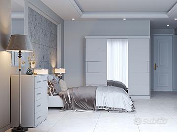 L’abbinamento di letto, comodini, comò e armadio crea un insieme armonioso e ben organizzato, perfetto per chi cerca una camera da letto che unisca stile, funzionalità e grande capienza.
