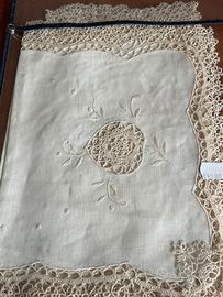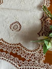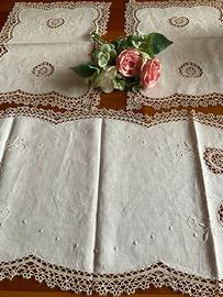 Composto da 4 centri più piccoli di cm .30 per 43 e da uno più grande di cm. 34 per 70, in lino leggero ricamato a mano e bordo e applicazioni in pizzo chiacchierino, colore avorio