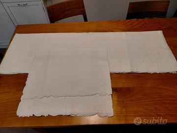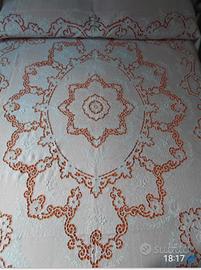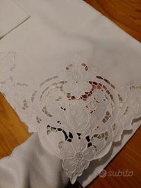 Di altissimo pregio, l'intaglio è eseguito con estrema precisione. I "ponti" sono regolari e fitti. Il rosone centrale e i decori a festone sui bordi sono complessi e armoniosi. Punto pieno e punto erba per i dettagli floreali. Un pezzo d'epoca che rappresenta l'eccellenza dell'artigianato italiano del secolo scorso. Set completo (copriletto + lenzuolo sopra coordinato + federe) in condizioni perfette (senza strappi o aloni indelebili). Dedicato al mercato del collezionismo o del vintage di lusso valore 1.500€ Possiedo anche tovaglia coordinata da 12 con tovaglioli e tovaglia da the. oreferisco vendere tutto il set a 2300 non trattabili.