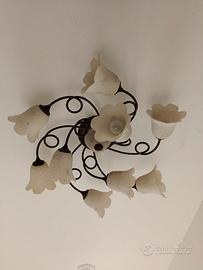 Coppia di lampadari. Struttura in ferro battuto color bronzo. Uno a nove luci e uno a tre luci.