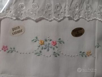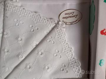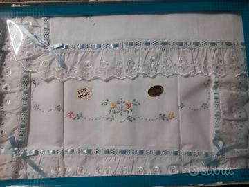 Vendo mai usato , completi lettino 1 lenzuolo sopra con federa e nastrino blu 1 lenzuolo sopra più federa in cotone sangallo E 1 lenzuolo sotto con angoli