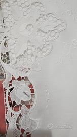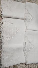 Completo letto matrimoniale in puro lino di una volta ricamato a mano e con pizzo Burano. Nuovo,lavato solo una volta per la preparazione del corredo e tenuto sempre nel cassetto.