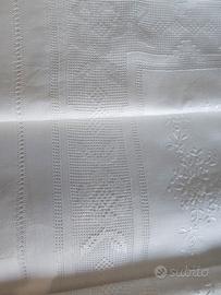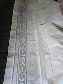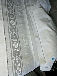 Completo letto matrimoniale da corredo in puro lino con meravigliosi ricami a mano. Nuovo. Mis. 270x280 Federe 95x60. In regalo un lenzuolo per sotto in cotone nuovo.