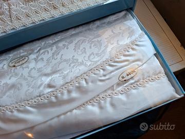 vendo per inutilizzo completo letto matrimoniale, fa parte di dotte matrimoniale, mai usata. NUOVO in confezione integra,, composto di lenzuolo sotto con angoli, lenzuolo sopra, 2 federe e copriletto. colore avorio.
