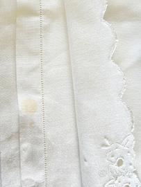 Elegante completo letto matrimoniale anni 60 in misto lino con ricami fatti a mano a punto intaglio . Nuovo. Presenti alcuni lievi aloni da baule eliminabili al primo lavaggio(ultime due foto) Mis.235x280