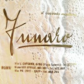 Mussola Nevada, come recita la stampigliatura in oro, con ricamo a roselline su pizzo sangallo, bianco latte. Di una bellezza inaudita.