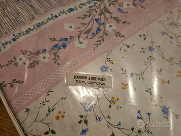 Vendo completo letto matrimoniale 100% cotone con due federe disegno fiorellini. Misure sottolenzuolo senza angoli circa cm 263 x 242, misura lenzuolo circa cm 241 x 268, indicate in foto. Confezione aperta solo per fare le foto, lenzuola mai utilizzate. Disponibili altre foto su richiesta