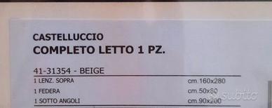 Completo letto singolo Bassetti Mod. Castelluccio 41 composto da: • Lenzuolo sopra effetto copriletto 160x280 • Lenzuolo sotto con angoli 90x200 • una federa 50x80 100% cotone