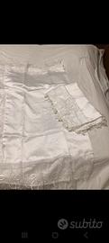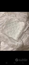 vendo completo letto matrimoniale che comprende:copriletto trapuntato con bordi in tulle, lenzuolo sotto e sopra con federe in seta con bordi ricamati colore bianco