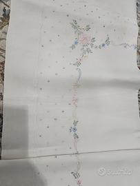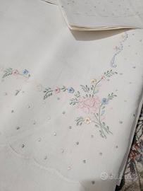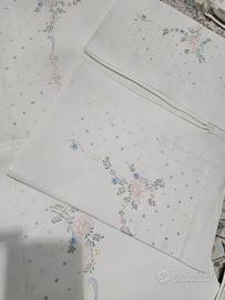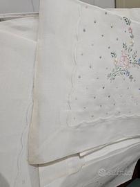 NON SPEDISCO CON POSTE ITALIANE Completo letto matrimoniale in puro lino ricamato a mano con delicati fiorellini e pois. Tessuto Bassetti. Nuovo mai usato né aperto. Misura 236x280. federe 88x60 Presente lieve ingiallimento sui bordi dovuto alla conservazione in cassetto. (ultima foto)