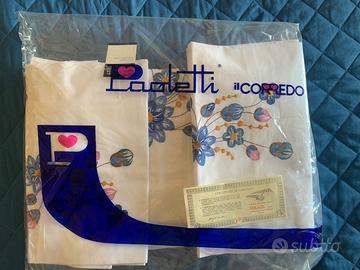 Completo matrimoniale Riva Paoletti,colore bianco,composto da 2 lenzuola (il sotto senza angoli) e 2 federe. Il lenzuola di sopra e le due federe sono ricamati con motivi floreali. Il completo matrimoniale è una king size. Il completo e nuovo con cartellino e certificato di garanzia.