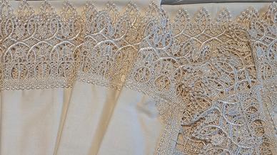 Completo matrimoniale composto da lenzuolo dim. 285 x 240, lenzuolo sotto con elastici e due federe, cotone con macramè, colore avorio panna