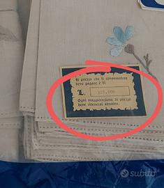 Acquistato molti anni fa e mai usato . Completo tavolo in lino con ricami a mano. Pagato 325 mila lire della vecchia moneta.