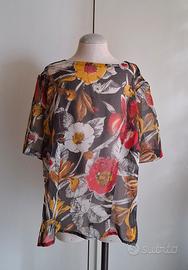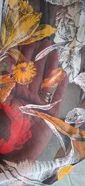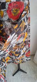 Bellissimo completo vintage composto da blusa a maniche corte e gonna midi coordinata, caratterizzato da una splendida stampa floreale macro nei toni del rosso, ocra e bianco su fondo scuro. Un set versatile e leggero, perfetto per la stagione primaverile ed estiva. Caratteristiche Principali: Design: La blusa presenta un taglio morbido con scollo a barchetta e maniche ampie. La gonna ha un taglio dritto, leggermente a portafoglio, con chiusura in vita rifinita da bottoni tartarugati laterali. Tessuto: Materiale leggero e semitrasparente (tipo chiffon o voile), molto fresco e piacevole al tatto. Ideale da abbinare a una sottoveste o lingerie nude per un effetto ricercato. Stile: Look bohémien/retrò molto elegante. I pezzi possono essere indossati insieme per un effetto "abito intero" o separatamente per creare outfit differenti. Dettagli: Bottoni decorativi e funzionali sulla vita della gonna. Condizioni: Capo in ottime condizioni vintage, ben conservato e senza difetti evidenti. Taglia S/M