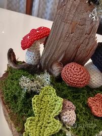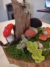 Composizione di funghetti foglie e ghiande eseguiti all'uncinetto in cotone 100 %.