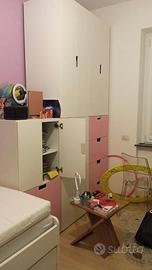 Vendo composizione modulare IKEA per cameretta bambina, perfetta per arredo rosa e bianco. Dettagli: Armadio alto con ante lisce bianche (4 moduli principali). Base con 4 cassetti rosa pratici e spaziosi. Scaffalatura laterale con mensole aperte per libri/giocattoli. Dimensioni approssimate: altezza 260 cm, larghezza totale ~180 cm. Materiale melaminico resistente, nessun danno visibile. Ideale per stanza kids, colori delicati e coordinati. Ritiro a mano a Cantù (CO), disponibile subito. No spedizione.