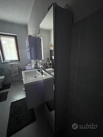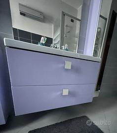 Bagno composto da : mobile con lavabo 85 cm Specchio L 80 cm / h 80 cm Pensile alto 4 ante 70x 70 cm Pensile basso 2 amte più 2 cassetti, 70 x 70 cm Pensile specchio 150x 35x 23 cm Color glicine