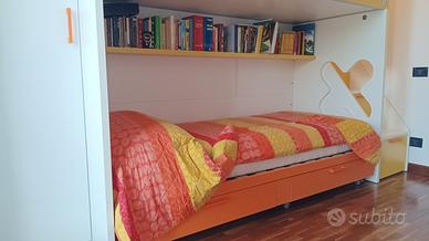 Composizione arredo composta da: armadio, letto a castello (letto inferiore con due cassettoni), 2 mensole e una scaletta con 3 cassettoni, 2 reti, 2 materassi e 2 copriletti (vedi foto). Dimensioni: lunghezza 330 cm, altezza max 225 cm, larghezza 90 cm. La struttura si presenta in buone condizioni, e' possibile prenderne visione previo appuntamento. Costo complessivo € 600, 00 non incluso smontaggio e trasporto.