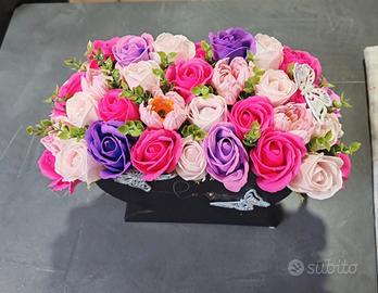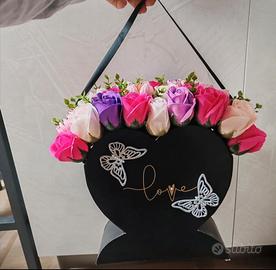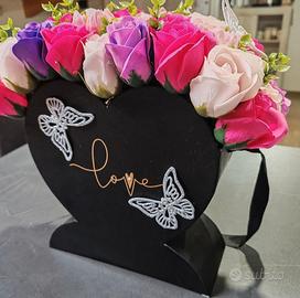 Composizione di rose finte sui vari toni del rosa e viola, disposte su una scatola nera a forma di cuore con scritta dorata "love" decorata con farfalle. Dimensioni: l 23 cm × h 30 cm. Ottima idea regalo o semplicemente per decorare la propria casa. Vendo per mancanza di spazio.