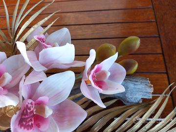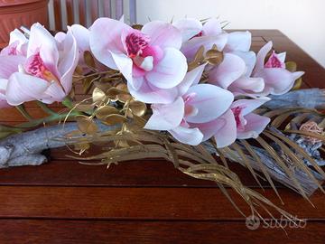 Composizione di orchidee artificiali. Sono di colore rosa con sfumature. I fiori sono montati su un ramo decorativo. Lunghezza cm. 70