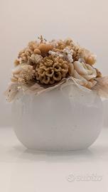 Composizione floreale realizzata a mano. Il vasetto di forma sferica è in gesso ceramico di alta qualità, decorato con rose in cera, e impreziosito da piccoli fiori secchi.