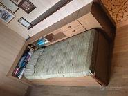 Composizione letto con secondo elemento estraibile e sollevabile al livello del primo in laminato color frassino, completi di reti e materassi. L'elemento principale è corredato da mobili che offrono appoggio e spazi su due lati, con mensole, vani e due cassetti ad uso comodino. Soluzione di grande praticità e qualità di gran lunga superiore alle proposte della grande distribuzione. Misure letto LxHxP: 198 x 36 x 86 Mobiletti altezza 76 e profondità 27 NB: sono necessari il ritiro al piano terra e un adeguato mezzo per il trasporto.
