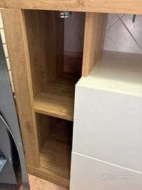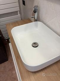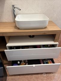Mobile bagno a terra bianco lucido e legno color rovere chiaro con due grandi cassetti, lavandino quadrato e miscelatore a cascata. Abbinato anche specchio con luce e mobiletto. Scomparti aperti vicino ai cassetti. Mobiletto vicino allo specchio contiene tre scomparti. Utilizzio un anno. Unico difetto (come si vede nell’ ultima foto) è stato fatto un taglio su entrambi i lati per incastrarlo con la nostra piastrella. DIMENSIONE MOBILETTO: Altezza 79 cm Lunghezza 110 cm Lunghezza portasalviette 6,50 cm (da agg. alla larghezza totale) Largezza parte marrone 44 cm Largezza con i cassetti bianchi 49 cm Lunghezza cassetti 87 cm Profondità cassetti 44 cm Altezza miscelatore 30 cm Lunghezza specchio più mobile 110 cm Lunghezza specchio 84 cm Lunghezza mobiletto 26 cm Altezza specchio 75 cm
